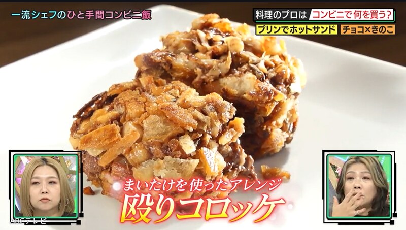 さらにORIGINのシェフは、コンビニで買ったマカダミアチョコレートと素焼きミックスナッツ、家で余ったまいたけを使って、ザクザク食感の香ばしいコロッケも作った。斬新な組み合わせのコロッケに西田は、調理中も試食中も驚きっぱなし。「まいたけ、香りしますわ! 最初はチョコレートの味がバ~ッてきたんでお菓子っぽかったんすけど」「歯ごたえがいろいろ変わっていて面白い。おいしい!」とコメントした。