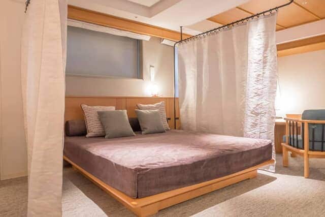 厚味があるベッドマットは120cm×200cm。ベッド下にはバッグを入れるスペースがあって、客室を広く使えます。どの客室も窓のカーテンレールが隠されているほか、エアコンを木枠で囲むなど、よりリラックスできる客室空間を配慮しています