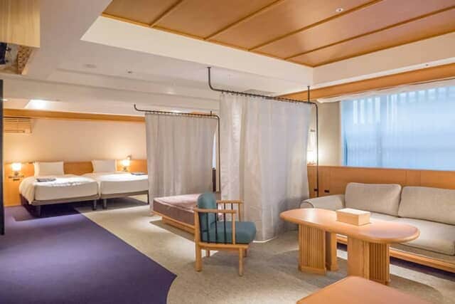67平米と広々した客室は、ツインベッドとデイベッド、リビングエリアの3つのゾーンからなっていて、計3台のベッドが置かれます。ミニキッチンやダブルベイシンの洗面を備え、大人4名まで宿泊可能。グループ旅行や家族旅行にもおすすめです。