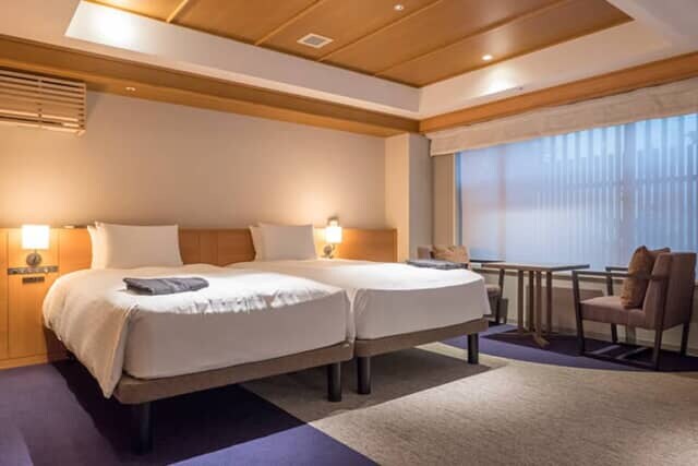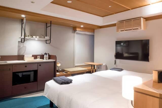 広さ26平米の「ツイン」は思いのほかゆったりしていて、ビジネスでも観光でも滞在しやすい客室です。ベッドは幅120cm×長さ200cmが2台置かれ、桐箱に入ったコーヒーや一保堂のお茶、ミニキッチン、レンジ、洗濯乾燥機、リファをそろえたバスアイテムなど、すべてそろえたハイクオリティな客室です。
