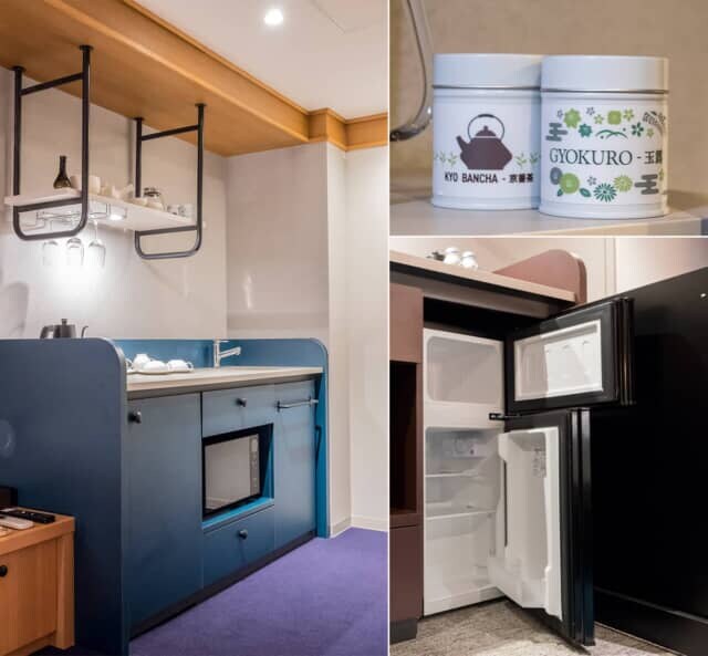 アイスクリームなども入れられる2ドアの冷蔵庫や電子レンジも備えます。引き出しの中にはカトラリーがそろっていて連泊にも便利。缶に入った茶葉は一保堂茶舗の玉露とほうじ茶の2種類。茶筅もあるので、客室でお抹茶を点てることができました。
