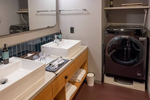 夏の京都旅で苦労するのが洗濯です。ホテルのコインランドリーが争奪戦になることが多く、並ぶ人も見かけます。その点、洗濯乾燥機を全客室に備え、洗剤も用意。客室タイプによって設置場所は異なりますが、「ラグジュアリースイート HANARE」はベッドから離れた位置で、音が比較的気にならないように考えられています。