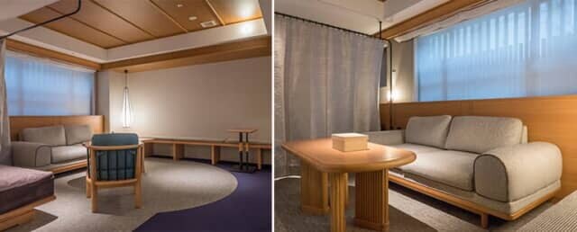 リビングも、となりのデイベッドとのカーテンを開けるとさらにスペースが広がります。テーブルを照らすダウンライトは、ソファに深く座ると光が直接当たらなくなり、よりくつろげるように向きを調整。ゲストの過ごし方を配慮した客室です。