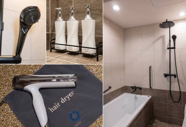 洗面・バス・トイレは全室独立タイプで、全客室に「ReFa(リファ)」製品をそろえているのも高ポイント。黒いシャワーヘッドは「FINE BUBBLE U」、ドライヤーは「BEAUTECH DRYER SMART W」を用意。さらにシャンプー、トリートメント、ボディウォッシュはホテルでは珍しいリファの「BEAUTECH HAIR CARE SERIES」を備え、泡立ちと洗い上がりがよく、髪が驚くほどサラリとまとまります。フロントでは販売もしています。