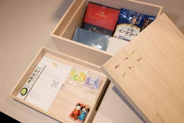 京都の老舗喫茶店、イノダコーヒと小川珈琲の2種類のコーヒーをそろえ、どちらも試せるのは特別感がありました。元治元年(1864年)創業の「伊藤軒」の金平糖も用意され、美味しいお茶やコーヒーも嬉しい京都体験です。