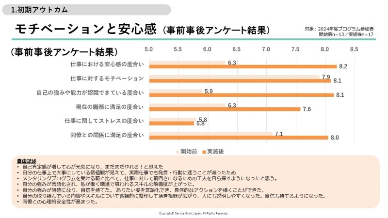 また、この変化は職員自身だけにとどまりません。支援を必要とする受益者への対応にも良い影響が広がり、3000人を超える受益者にポジティブな変化が届けられたという結果も示されています。新しいアイデアが生まれ、活動が発展した事例や、企業からの協賛が得られるようになったケースもあり、現場の取り組みに新たな動きが生まれています。