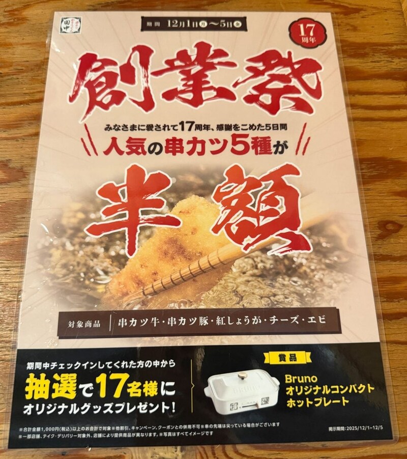 12月1日より、「串カツ田中」が創業17周年を記念し創業祭を行っている。