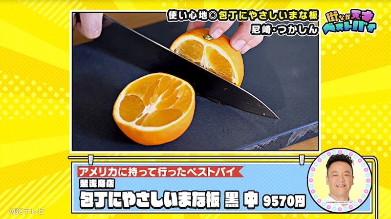 そんなたむけんのベストバイは、「アメリカに持って行ってるんやけどめちゃくちゃ便利!」という包丁にやさしいまな板。一般的なプラスチック製に比べて、柔らかくて弾力のある酢酸ビニル製なため、包丁が跳ねるような使い心地です。たむけんいわく、「結構料理人さんが使っているみたい。いろんなサイズがある」そうで、世界に誇れる日本のキッチンアイテムだと教えてくれました!