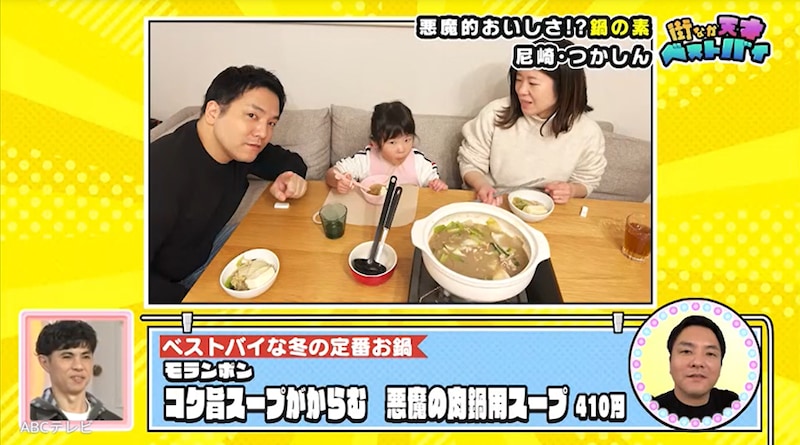 フードコート以外でも天才ピアニストは、さまざまな人にベストバイを聞きました。4世代家族は、全員がハマっている豚骨味の鍋の素・コク旨スープがからむ悪魔の肉鍋用スープがベストバイ。スープは「石灰岩みたいな、石が混じったみたいな色」をしていますが、その正体はもちろん石灰岩ではなく、香味野菜とごま油の旨みを凝縮した焦がしマー油。このマー油の悪魔的なおいしさが、商品名の元になっています。一家はこのお気に入りの鍋を食べたあとに、「うどんで締めたあとにごはんで締めます」とのこと!