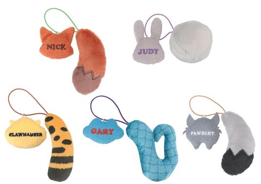ニック、ジュディ、クロウハウザー、ゲイリー、パウバートのしっぽがかわいいマスコット。