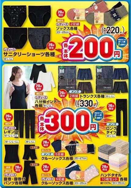 「サニタリーショーツ各種」や「ソックス各種 2足組」は220円、「レギンス」「腹巻・腹巻付パンツ各種」などが330円、「カップ付八分袖インナー各種」や「タイツ 3足組」などが550円と、インナーの種類がとにかく豊富。裏起毛のアイテムも多く、冬本番に備えてまとめ買いしても良さそう......!