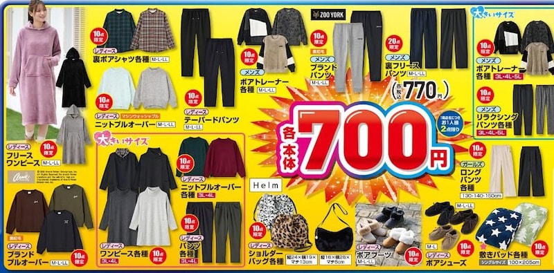 「フリースパーカ」や「ニットプルオーバー各種」は550円、「フリースワンピース」や「ボアブーツ」は770円、「キャラクタールームワンピース各種」や「ブランドバッグ各種」は990円。「キルトジャケット」や「中綿ジャケット各種」などの冬に手放せないアウターは、2200円で販売。冬のおうち時間やお出かけシーンを暖かく快適にサポートする、衝撃コスパなアイテムがズラリと並びます。