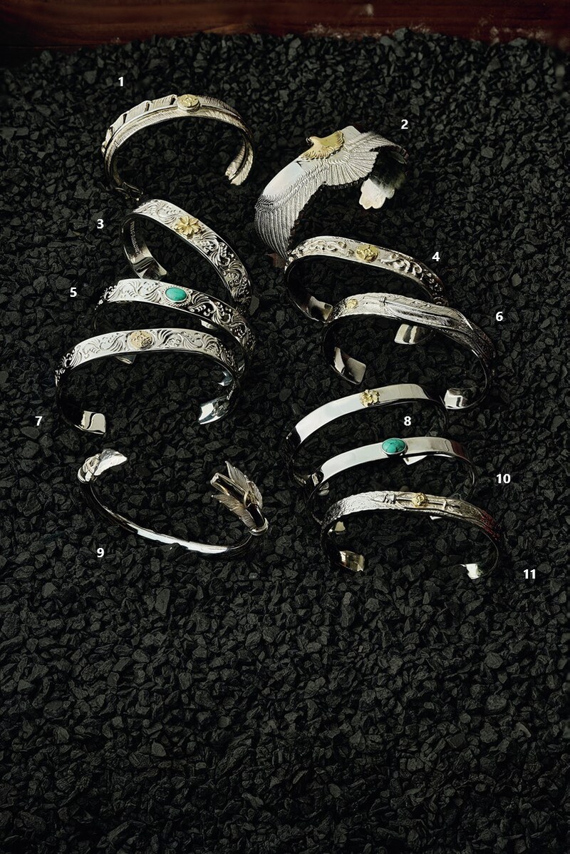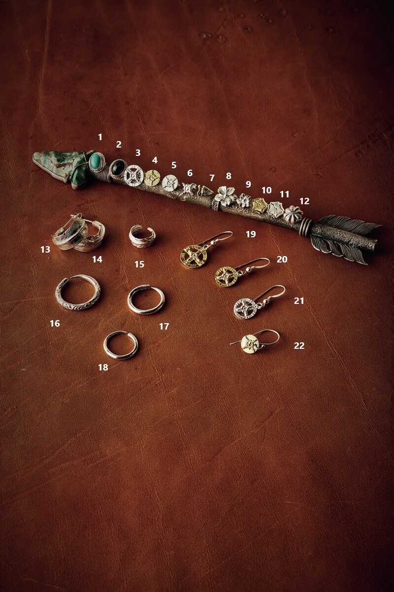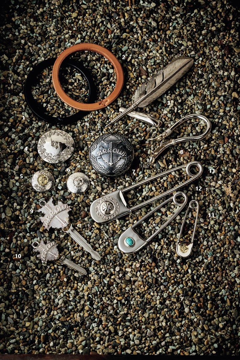 ネイティブアメリカンの伝統スタイルに軸足を置きつつも、現代のシーンにも違和感なくフィットするオリジナルのアイテムも多数てがけるファーストアローズ。キーフックやカスタムキー、ペン、安全ピン、シフトノブなど、装飾品だけでなく遊び心がちりばめられた実用品の数々は、シルバー上級者だけでく、普段はシルバーを身につけることができない人にはうってつけといえる。