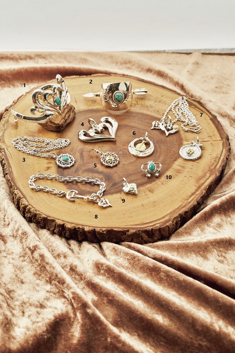 ネイティブスタイルのシルバーというとワイルドで男性的なイメージが強いが、繊細な仕上がりが特徴のファーストアローズなら女性に似合う作品も多数。デザインの美しさはもちろん、ゴールドやピンクシルバーといった素材使い、ハートやフラワー、子宮を象ったナジャなど、女性的なモチーフなどもある。これを機に愛するパートナーと共にシルバーライフを楽しんでみてはいかが?