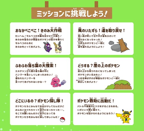 「めざせ!ポケモントレーナー」では、最初に自然の中で起こった問題を解決するための6つのミッションが与えられます。それぞれのミッションには、パートナーとなるポケモンを選び挑戦します。パートナーポケモンの特徴を理解して、ミッションを達成することで、自然の中で役立つ技能を学ぶことができます。