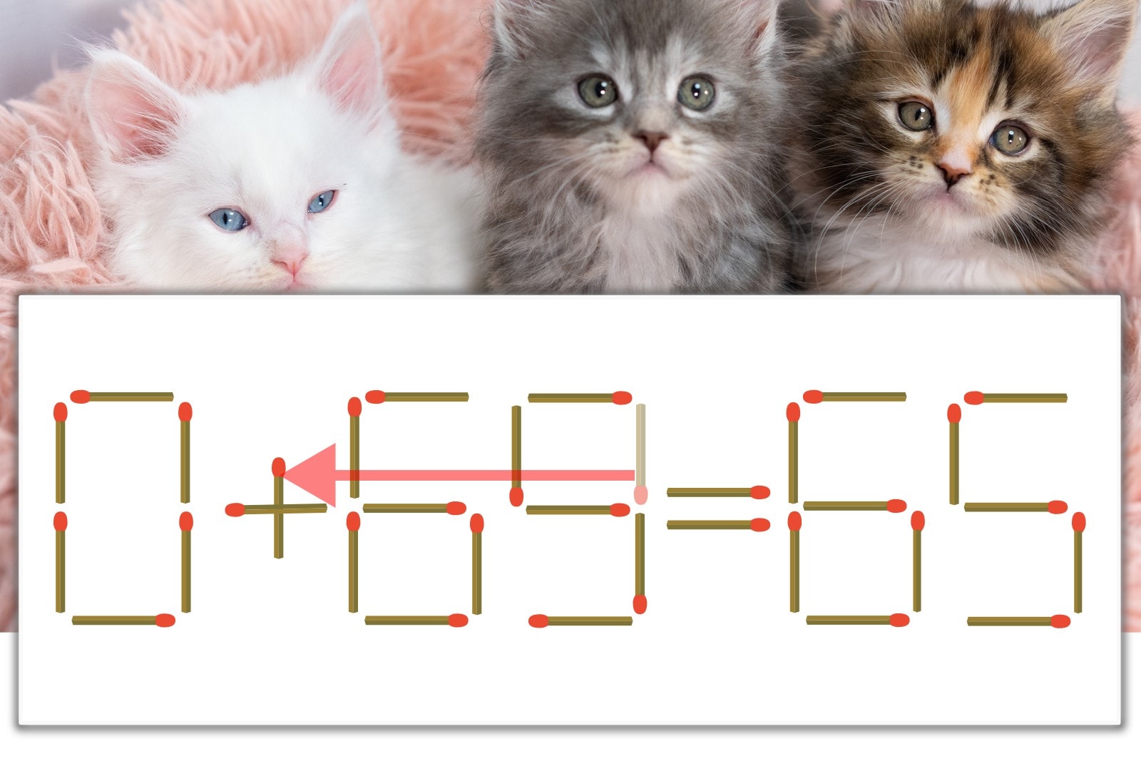 「9」を別の数字に変化させると答えが導き出せます。「9」のマッチ棒を1本移動して、「-」を「+」にしてみましょう。すると、「0+65=65」が成立します。