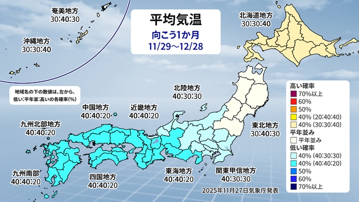 まず12月ですが、これは3か月予報の12月ではなく、最新(11月27日)の1か月予報を見てみましょう。