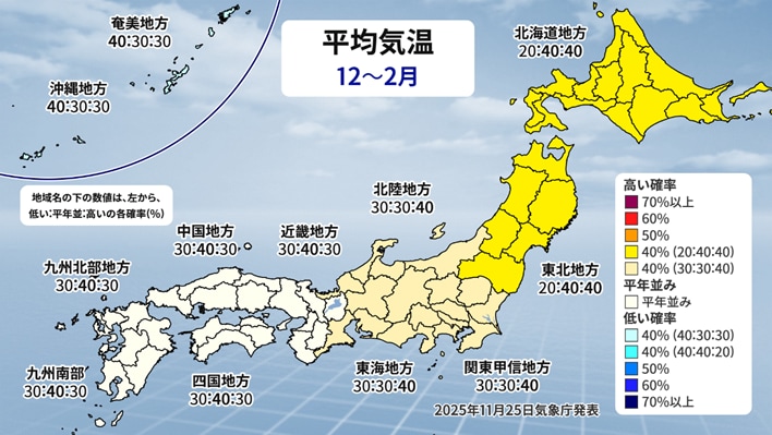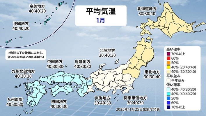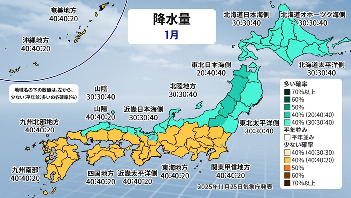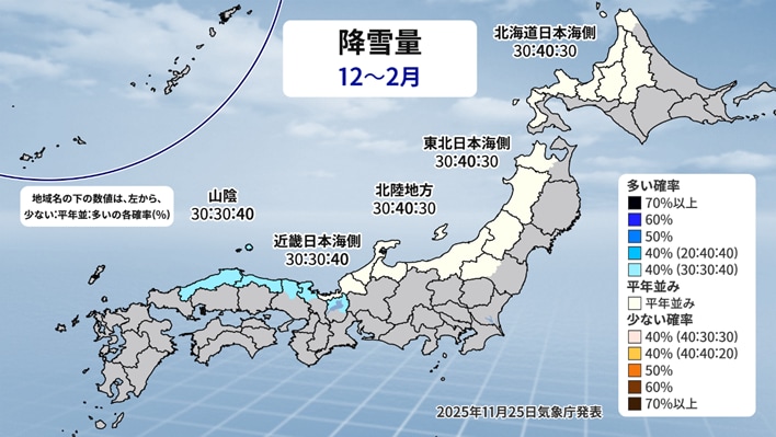 どの地域もほぼ平年並みですが、山陰は少し多い傾向が見られます。先ほどの気温と合わせると西日本は気温が平年並みか低い傾向で雪が多くなるようです。
