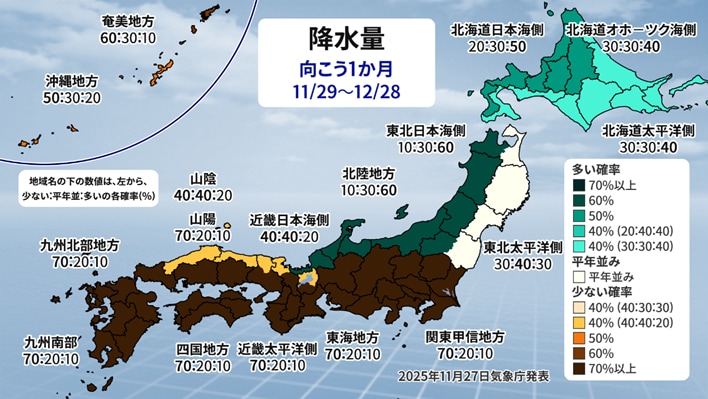 このため、寒気の動向を早くつかむには、最新の週間予報や2週間気温予報を小まめにチェックすることをお勧めします。あらためて、最新の1か月予報を見ると、日本海側の降水量が多く、太平洋側が少ないことから、冬型の気圧配置が強まることがわかります。