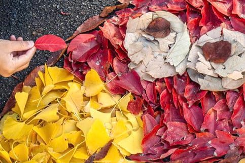 再現性の高さでしょうか。ぱっと見て、あっ! って気付いてもらえたらうれしいので、そこは毎回こだわります。そのためには、落ち葉の鮮やかな色味はもちろん、葉の裏の白さや、グラデーションになっている部分も、作品の色を想像しながら集めます。光のあたり具合も作品として残すなら大事ですので、影にならないよう注意しました。