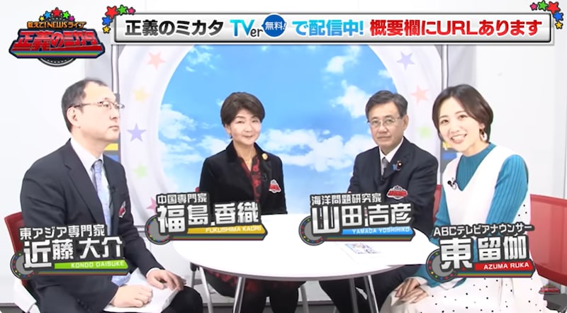 ニュースの正しいミカタを徹底解説する情報バラエティ番組「教えて!ニュースライブ 正義のミカタ」(ABCテレビ)。東留伽アナがMCを務める番組公式YouTubeチャンネル「正義のミカタチャンネル」が12月2日に公開した動画のテーマは “日中関係の真実”。東アジア専門家の近藤大介氏、中国専門家の福島香織氏、海洋問題研究家の山田吉彦参院議員がぶっちゃけトークを展開!