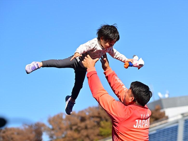 9月に国立競技場で行われた東京世界陸上にも出場した男子円盤投げの湯上は、一般の日本記録(64m48)を持つスター選手だ。今大会は、自身が持つデフ世界記録に届かなかったものの、貫禄のパフォーマンスで大会新(58m93)をマーク。デフリンピックで自身初となる金メダルを獲得した。東京世界陸上と異なる点として、デフ世界記録保持者だから勝てるだろうという重圧があったという湯上。プレッシャーから解放された湯上は、例年よりも長いシーズンを終え、3歳の息子を高く持ち上げた。