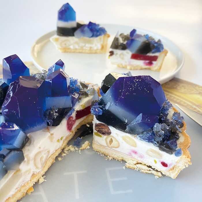 「誕生石のタルト〜12月ラピスラズリ〜」は、冬の夜空を思わせる濃い群青のこうぶつヲカシをランダムに配置し、金箔を散らすことで宝石のような輝きを再現したアイスケーキタルト。
