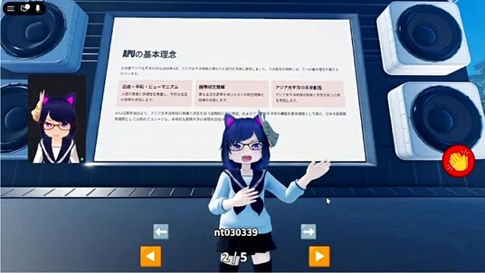 APUの象徴的な建物や広場をオンライン上に再現し、在学生・卒業生・教職員が世界中から集えるソーシャルハングアウト空間として機能します。また、コミュニケーション機能のほか、講義や発表に使えるプレゼンテーション機能を搭載。単なる交流の場にとどまらず、教育・研究活動にも活用可能です。バーチャルオープンキャンパスや国際学生会議などの実施も想定されています。