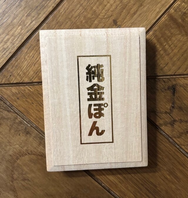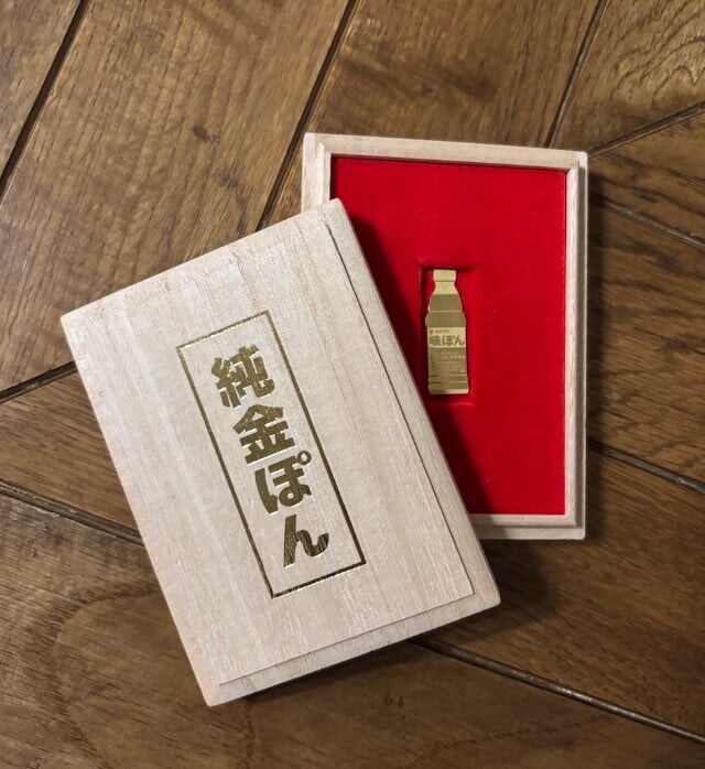 まず紹介するのは、純金に味ぽんのデザインを刻印した「純金ぽん」。木箱のふたを開けると、手のひらにぽんっと乗るサイズの純金ぽんが登場する。