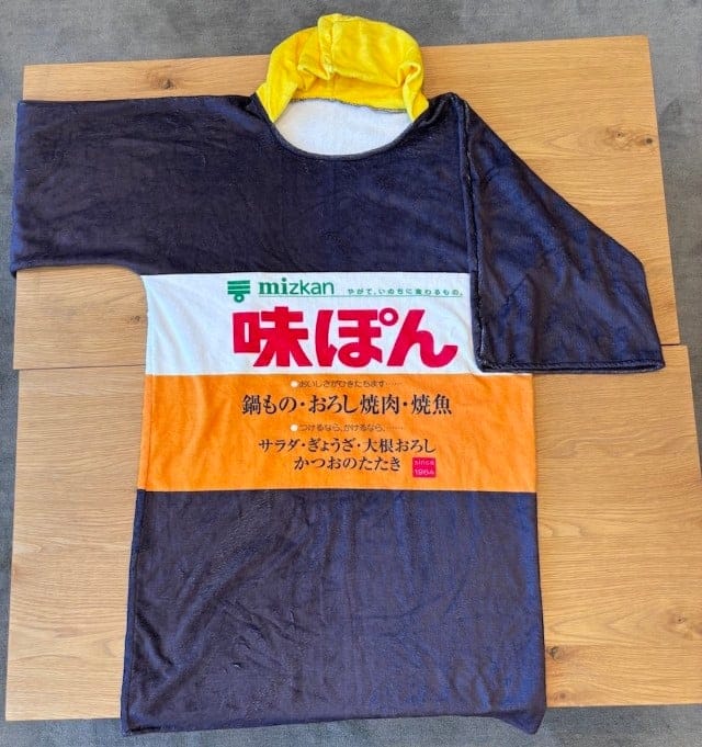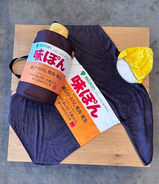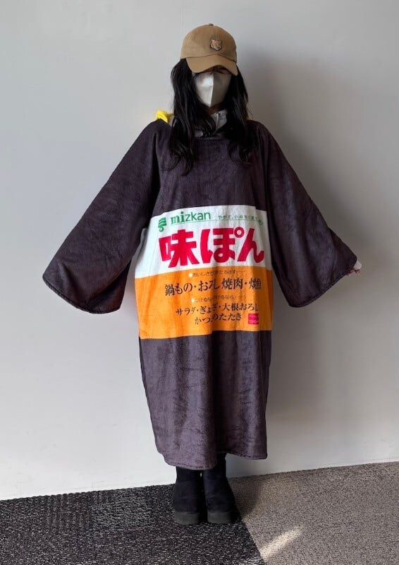 続いては、フードをかぶると味ぽんそのものになれる着るブランケット「ブランケッぽん」。空気がひんやりしてきた最近、これを羽織って鍋を囲めば、全身で味ぽんを楽しむ冬が完成する。