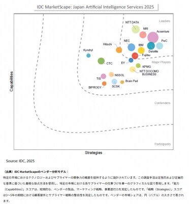 本レポートは、国内のAIサービス市場における主要ベンダー各社を対象に、「戦略(Strategies)」と「能力(Capabilities)」の観点から、IDC MarketScapeモデルに基づいて評価・分析した結果を示したものです。