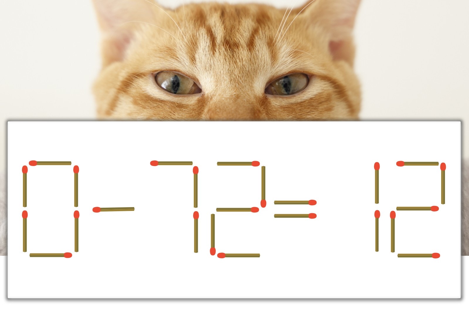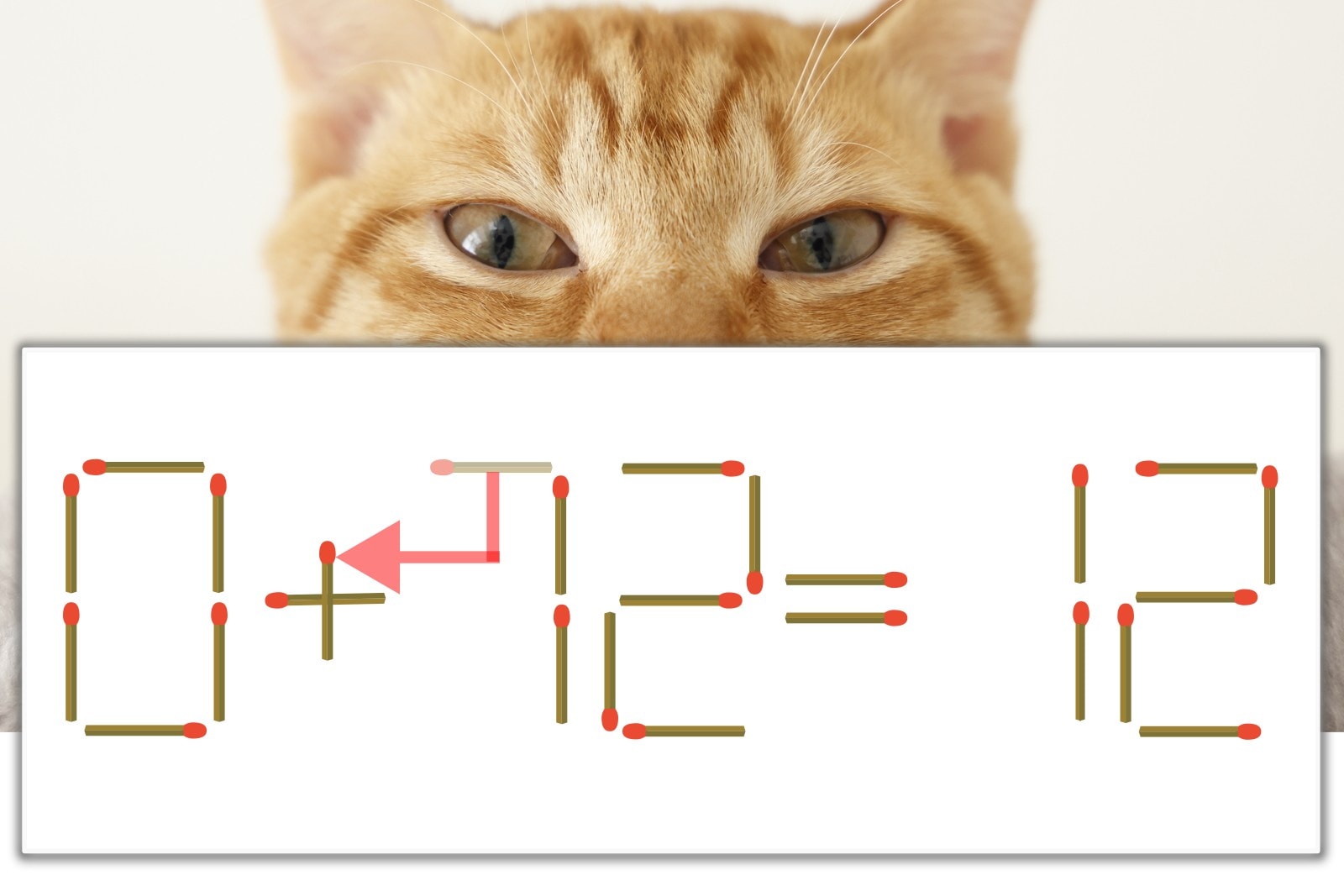 「7」を別の数字に変化させると答えが導き出せます。「7」のマッチ棒を1本移動して、「-」を「+」にしてみましょう。すると、「0+12=12」が成立します。
