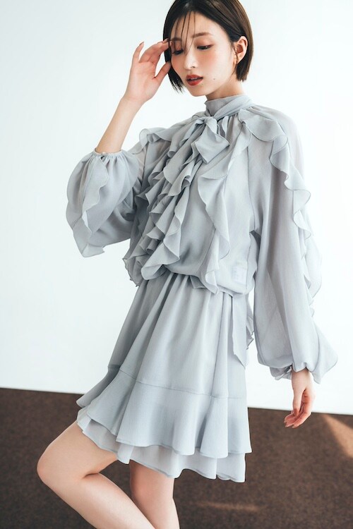 上下別々に着ることができるのが最大のポイント。フリルブラウスとしてデニム合わせにも、スカート部分はスウェットなどの合わせにもおすすめです。