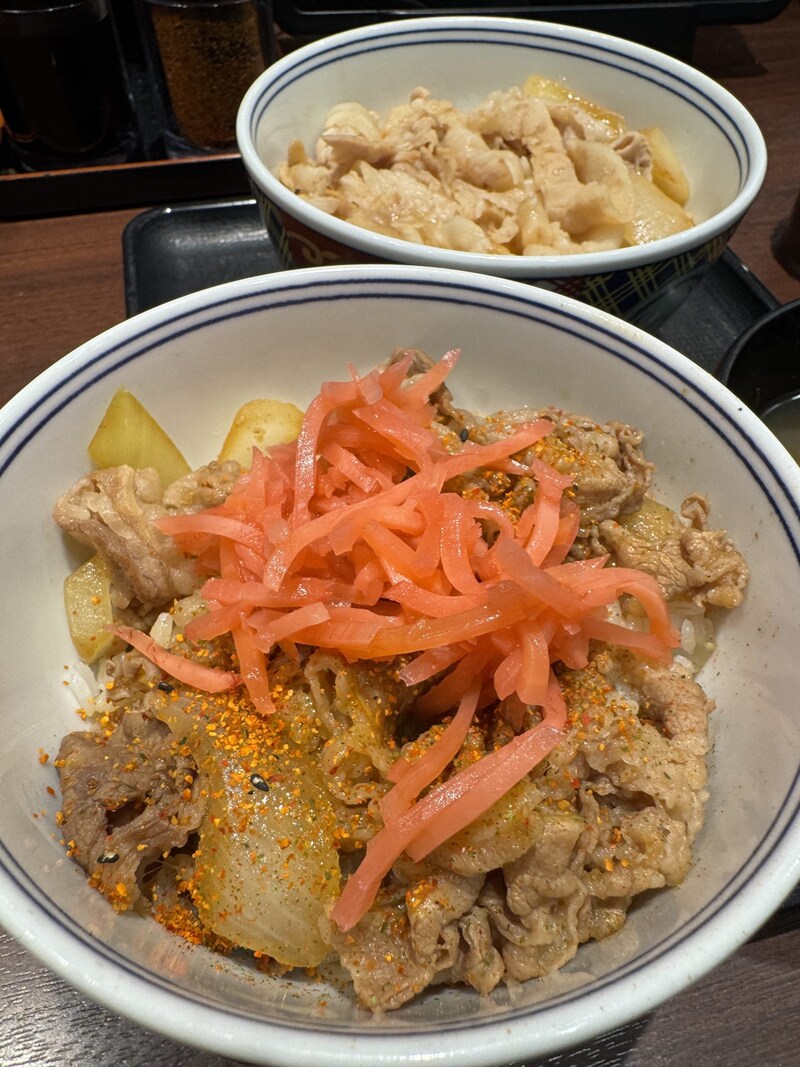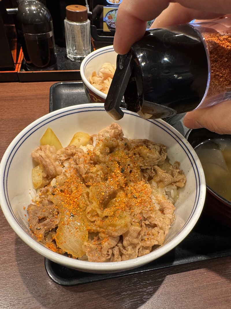 牛丼は七味唐辛子と紅生姜で食べる。うまい、うますぎる。この牛丼の味に関しては、もはや言うまでもなく、うまい。歴史と職人の技が織り成す伝統の味。