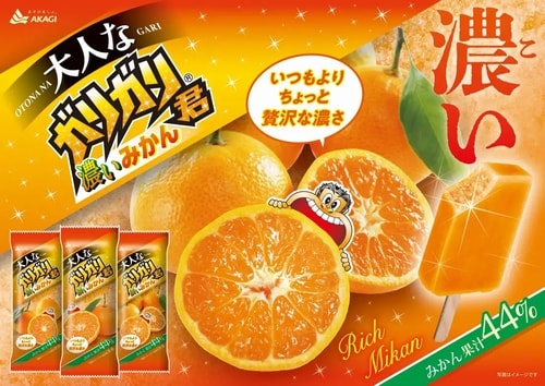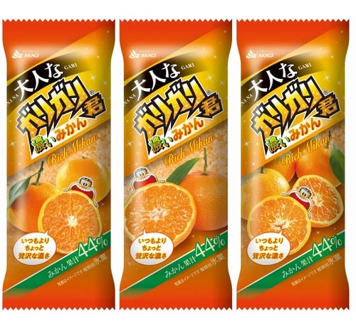 2025年12月4日 みかん果汁44%使用の“ジューシーなガリガリ君”「大人なガリガリ君濃いみかん」 ナリナリドットコム 赤城乳業は12月9日から、みかん果汁を44%使用した「大人なガリガリ君濃いみかん」を発売する。価格は151円(税込み)。「大人なガリガリ君濃いみかん」は、みかん味のアイスキャンディーに、シャリシャリ食感のジューシーなみかんかき氷を入れたアイスキャンディー。みかん果汁を44%使用した冬向けの濃い味わいで、甘さやシャリシャリ食感にもこだわった、本格的なみかんの果汁感を楽しめる、“ジューシーなガリガリ君”だ。