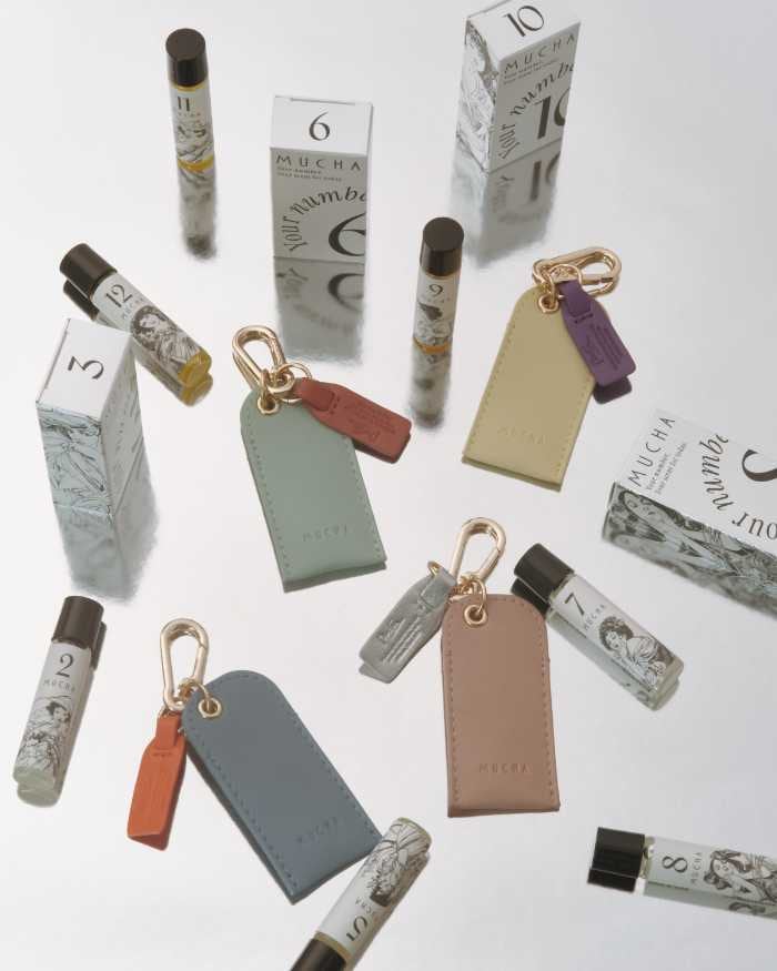 四季折々の情景とミュシャの世界観を重ね合わせたMUCHAの「ユアナンバー フレグランスオイル」と10色のフレグランスチャーム。