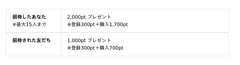 友達招待および購入で獲得できるポイントが、通常800ptのところ期間中は2,000ptに増加します。