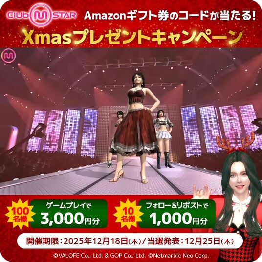 株式会社G・O・P[本社:東京都新宿区、代表取締役社長:申 載明(シン・ジェミョン)]は、PC向けオンラインダンスゲーム『Club M Star』(以下、クラブ・エム・スター)において、2025年12月4日(木)より冬季限定イベントや新規衣装の追加を含む最新アップデートを実施いたしました。