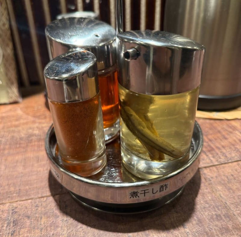 ひたすら混ぜて食べ、たまに味変で煮干し酢を。