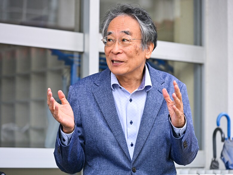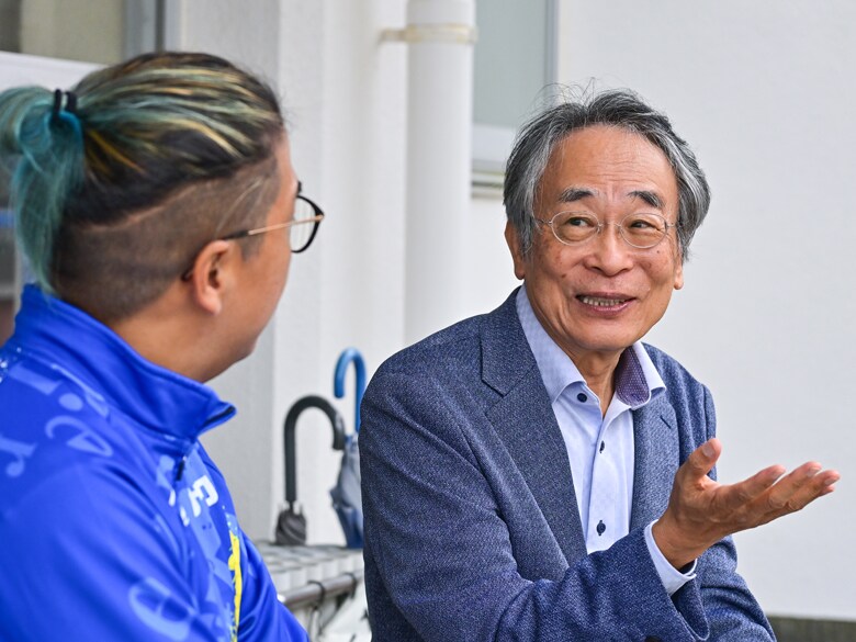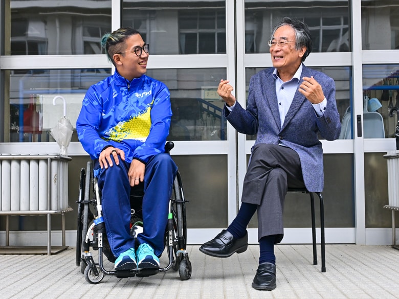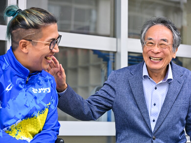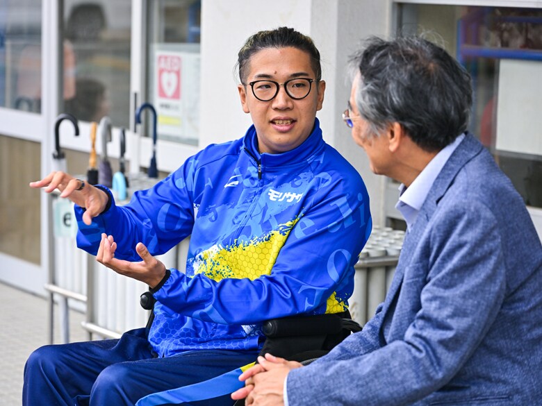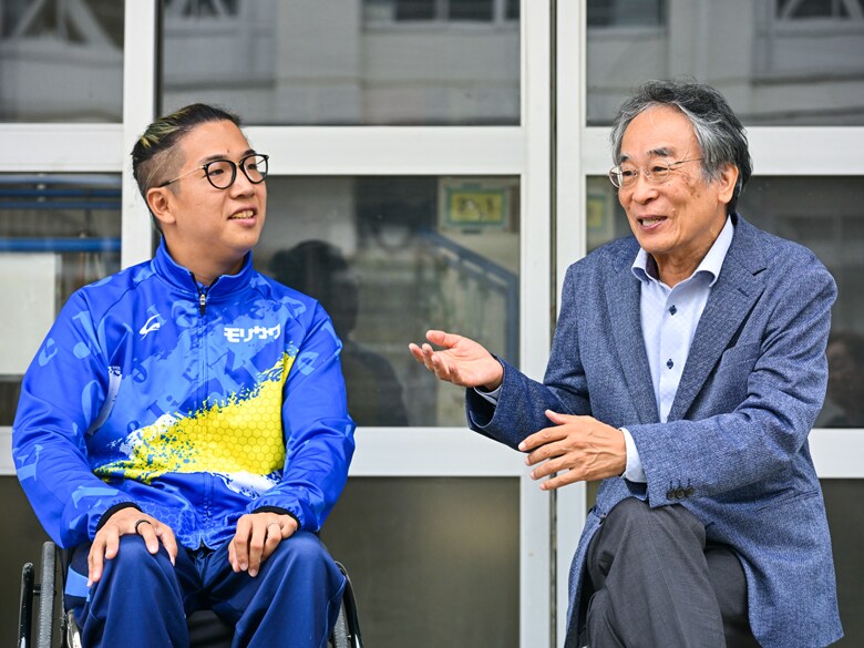 静岡県藤枝市にある佐藤の母校で対談が実現した友祈:僕の競技におけるスタンスは、どうしても「0か100か」「やるか、やらないか」になってしまうのですが、対子どもとなると、それが無効化されちゃって。でも、いま先生の話を聞いて、それでよかったんだと確認できました。