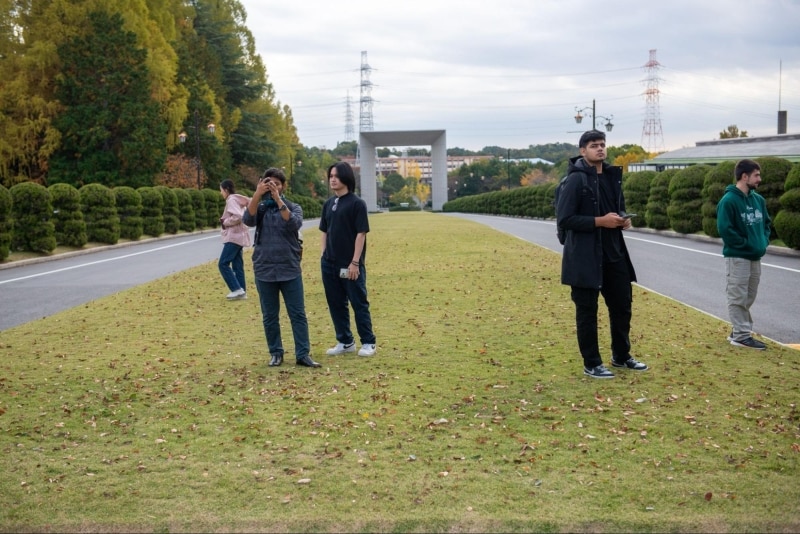 鳥の目・虫の目といった視点を意識しながら、木々の揺れ、池の光、風の温度など、普段は流してしまいがちな細かな変化に目を向ける姿が印象的です。スマートフォンで写真を撮る学生もいれば、静かに立ち止まって風景を眺める学生もいて、それぞれが自分の感覚に向き合いながらテーマを探していました。