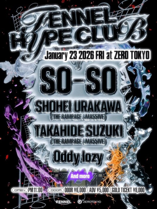 FENNEL初となる音楽イベントを、新宿・歌舞伎町のナイトエンターテインメントの発信地「ZERO TOKYO」にて開催いたします。 本イベントには「SO-SO」に加え、「浦川翔平」「鈴木昂秀」の2名が出演。さらに、追加アーティストの登場も予定しています。 深夜のZERO TOKYOで、ゲームカルチャーと音楽シーンがクロスオーバーする、かつてない熱狂をお届けします。
