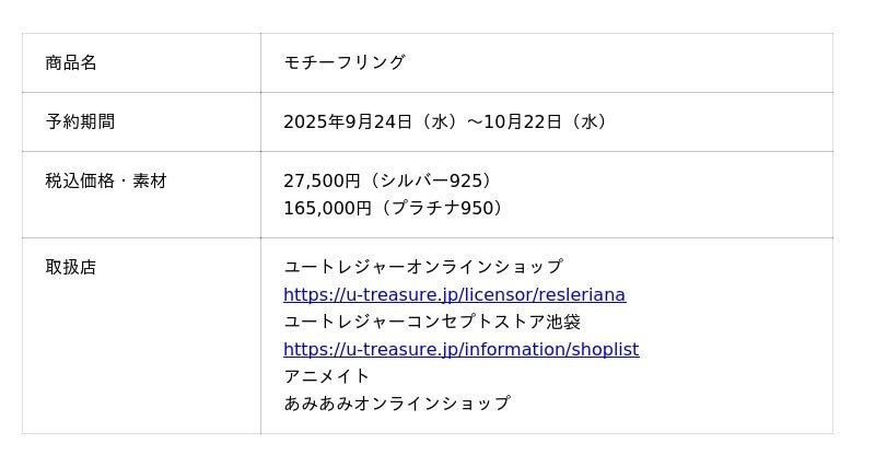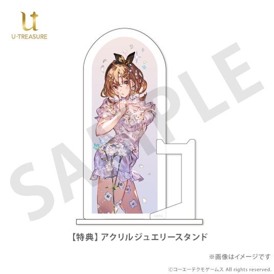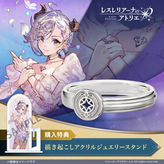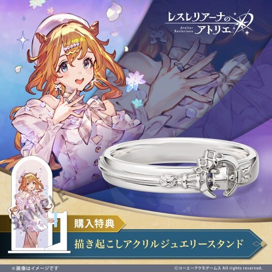 今回の新作は【レスレリアーナのアトリエ】の「レスナ」「ヴァレリア」「ライザ」「ソフィー」の杖や武器をイメージしたリング(指輪)です。特典として、1点ご購入につき描き起こしアクリルスタンドを1つプレゼントします。