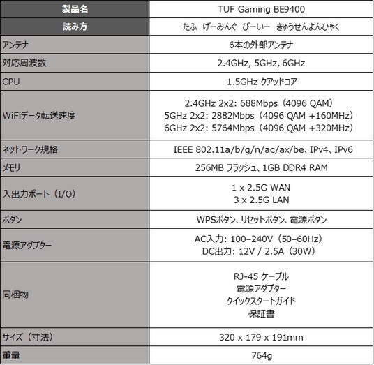 - 同梱物:本体(TUF-BE9400)、RJ-45ケーブル、電源アダプター、クイックスタートガイド、保証書