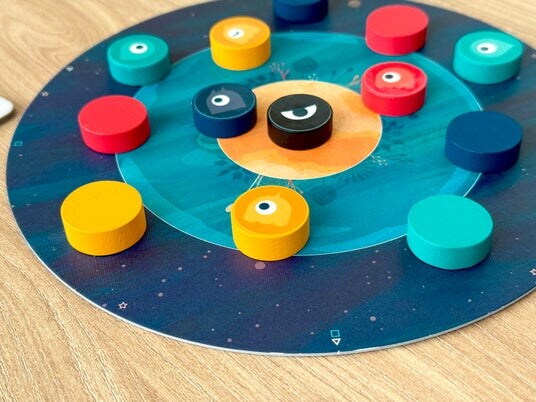 本作は、手元のコマを弾いて惑星に着陸させるアクション性と、着陸した数や強さで勝敗を決める戦略性を融合させたカーリングのようなボードゲームです。