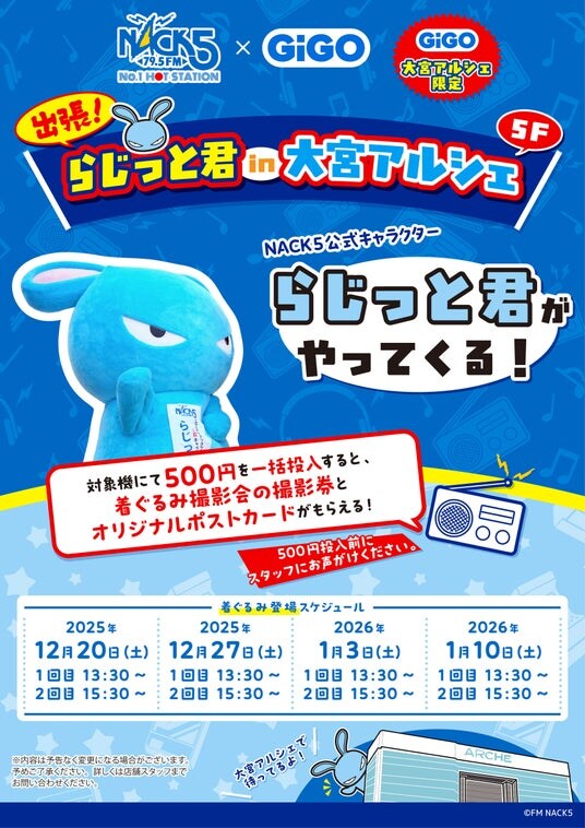 株式会社GENDA GiGO Entertainment(本社:東京都港区 代表取締役社長:二宮 一浩、以下「当社」)は、当社が運営する「GiGO大宮アルシェ」にて、2025年12月19日(金)より、首都圏を中心に放送しているFMラジオ局「FM NACK5」とのポップアップイベントを開催いたします。