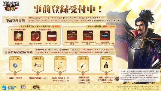 ストアで事前登録いただいた方に、「登用状×5」をプレゼント。使用すると星5武将を入手できるチャンスです。メールでの事前登録では、限定アイコン枠や限定プッシュ枠をプレゼント。PlayStation(R)5 Pro、Nintendo Switch2、Amazonギフトカード(1万円分)などの豪華賞品が当たるチャンスもご用意しています。