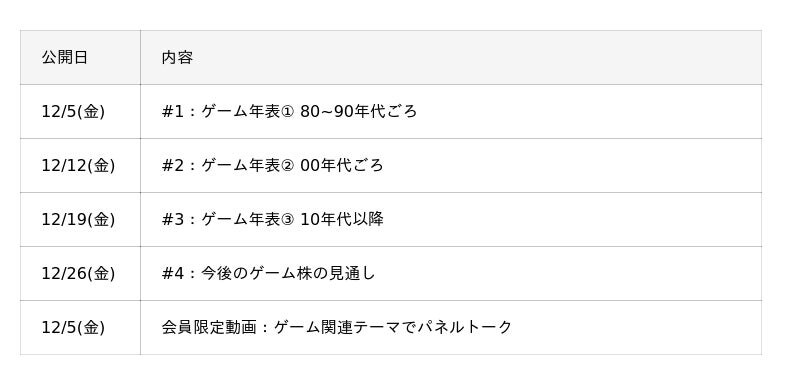 今回は、「ゲーム業界」をテーマに、80年代から現在までの家庭用ゲームの歴史を年表で振り返りながら、ゲーム業界銘柄への投資のヒントを探ります。なお、有識者には、タレント業の傍らゲーム開発にも携わるマヂカルラブリー野田クリスタル氏、フリーアナウンサーとして活躍する宇内梨沙氏をお招きします。投資視点からの業界分析には、ストラテジストの大川智宏氏、エコノミストのエミン・ユルマズ氏に登場いただきます。また、マヂカルラブリーの村上さんが司会として番組を盛り上げていきます。