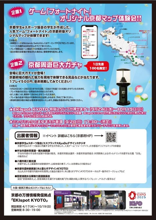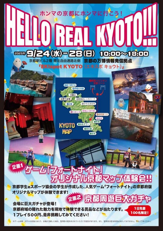 京都の学生を中心に新たな事業を創出し、グローバルカルチャーを創出する目的として設立された京都学生eスポーツ協会は、2025年開催の「大阪・関西万博」 において、関西パビリオン内の京都ゾーンおよび万博情報発信拠点である「EKIspot KYOTO(エキスポ キョウト)」のラストイベントに、学生が制作した「フォートナイト」オリジナル京都マップを出展・展示いたします。
