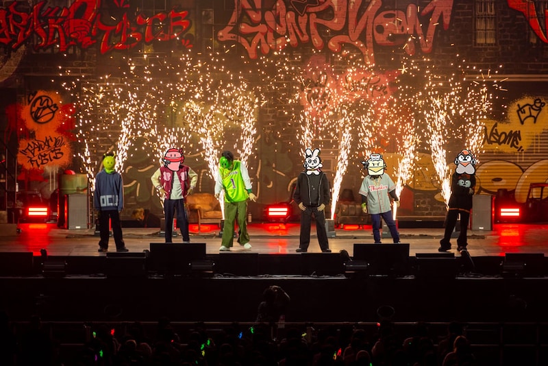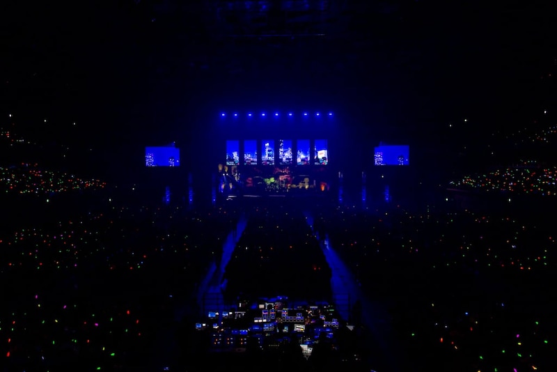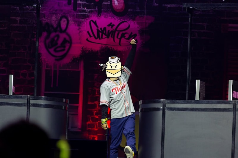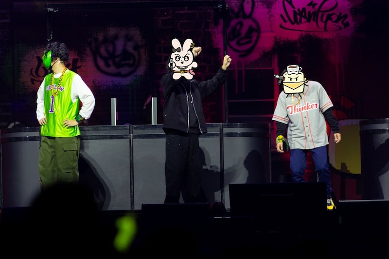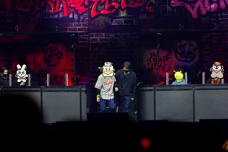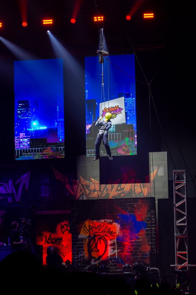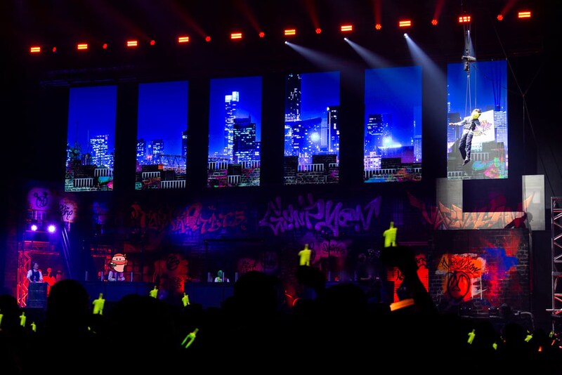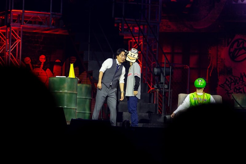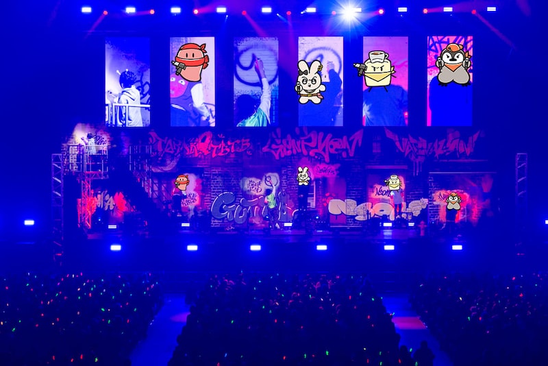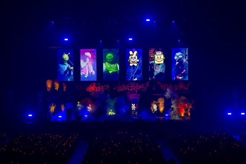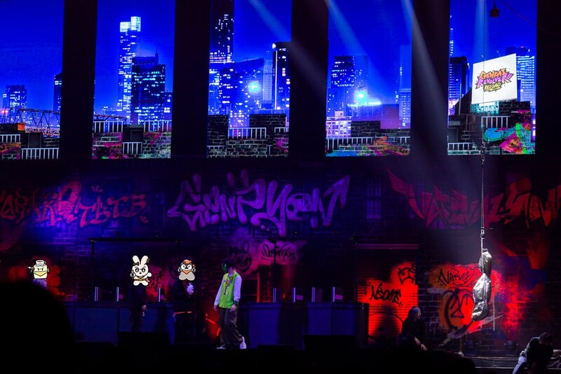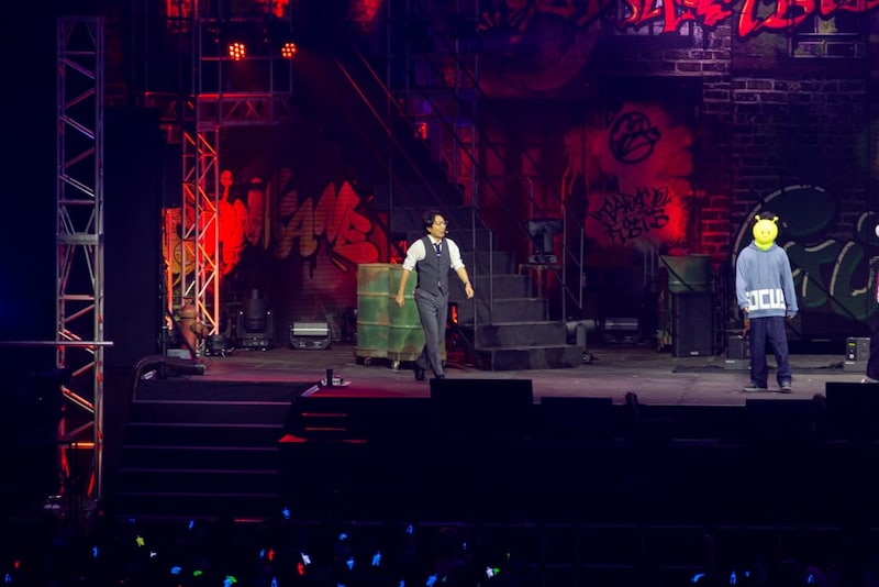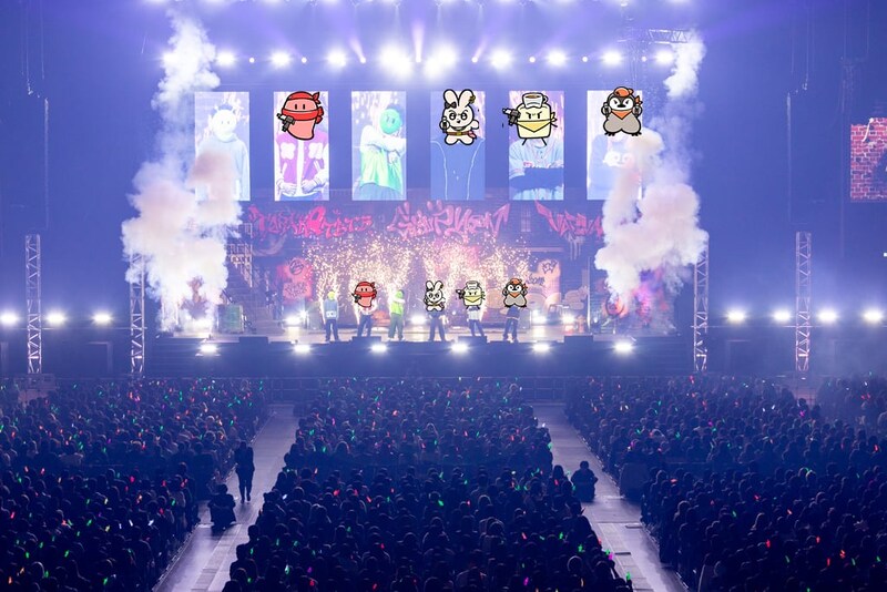 収容人数1万を誇るステージが満席となった今回。オープニングでは、スモーク漂う中、閃光とテーマカラーに包まれてのメンバー登場、一人ひとりによるグラフィティアートのパフォーマンス、激しく高みに立ち昇る火花から、「ドォン!」と会場を揺るがす爆発音に至るまで、いきなりド派手な演出で会場は大盛り上がりだ。